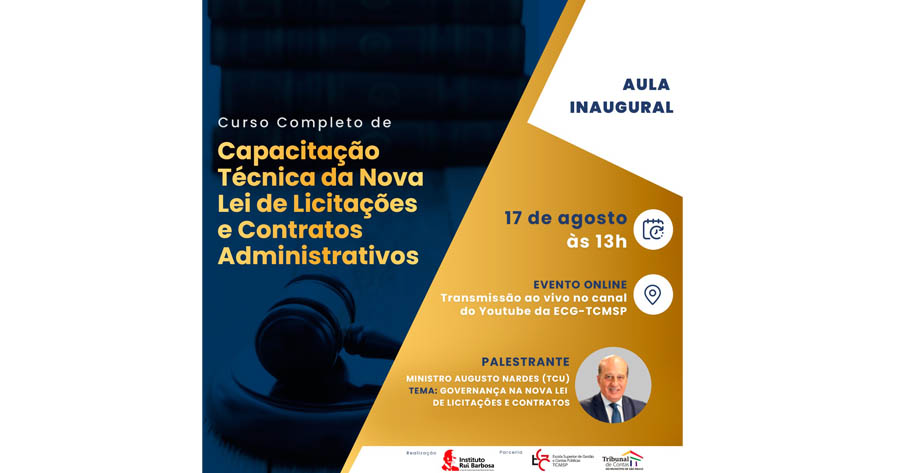 Na próxima quarta-feira (17), às 13h, a Escola Superior de Gestão e Contas Públicas do TCMSP (EGC-TCMSP) transmite, ao vivo, a aula inaugural e lançamento do curso “Capacitação Técnica da Nova Lei de Licitações e Contratos Administrativos”.