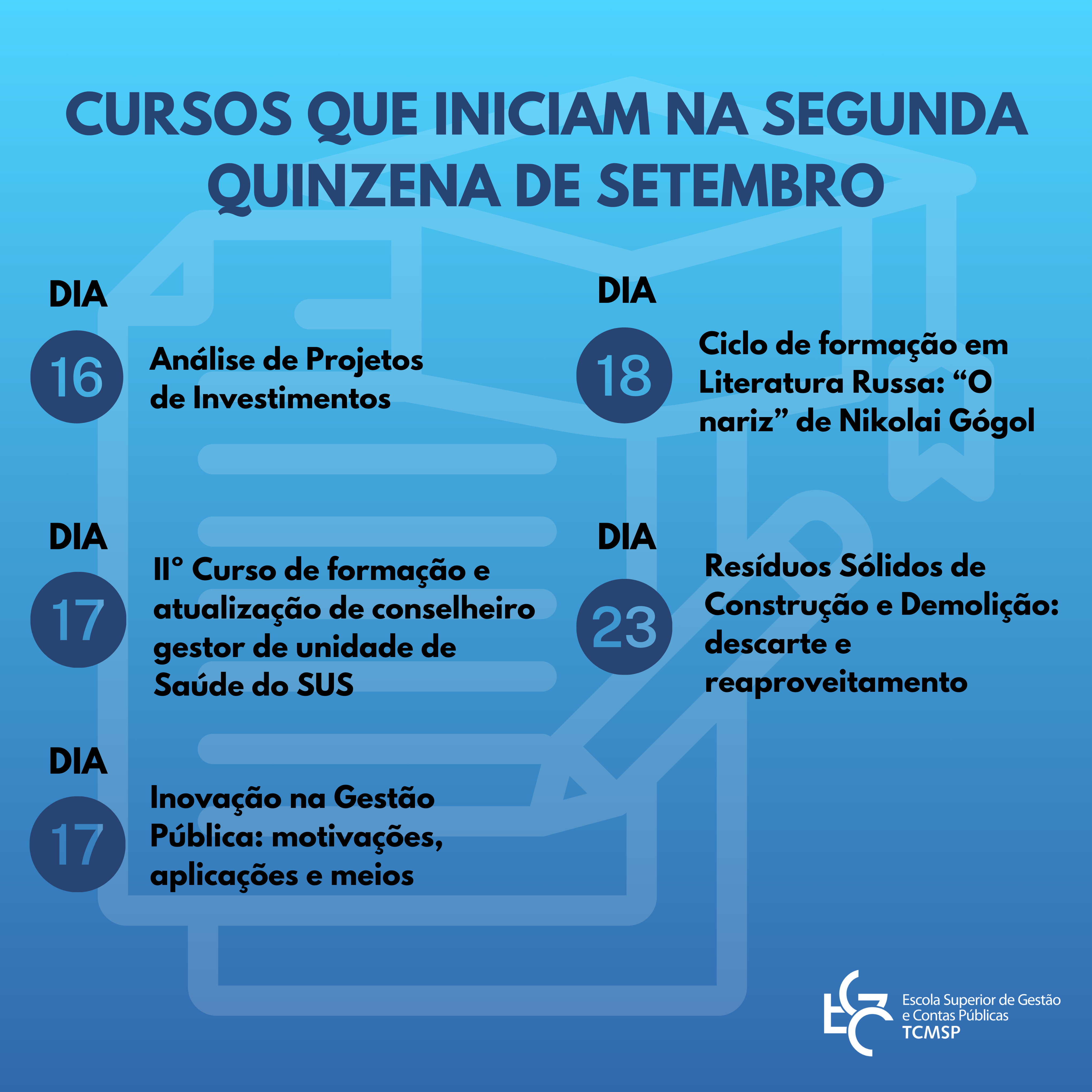Nesta segunda quinzena de setembro, a Escola Superior de Gestão e Contas Públicas (EGC) promove seis cursos, gratuitos e na modalidade on-line.